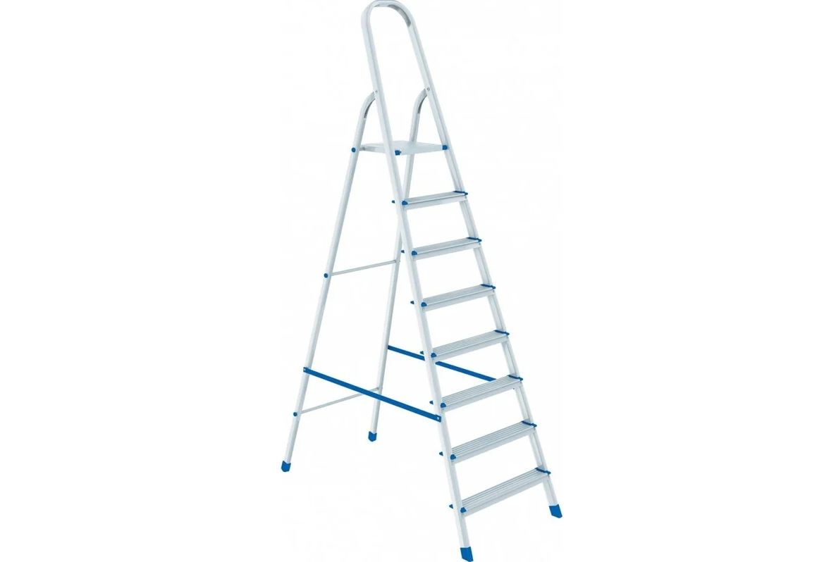 Стремянка имеет широкое устойчивое основание, высокую дугу безопасности, защищающую от падения.