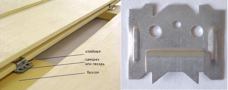 Металлическая деталь имеет отверстия для гвоздей или скоб, а также язычок, удерживающий облицовочный материал за паз.